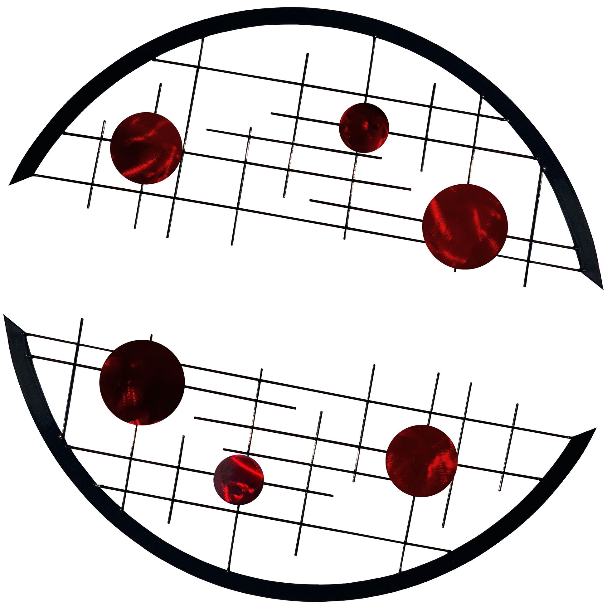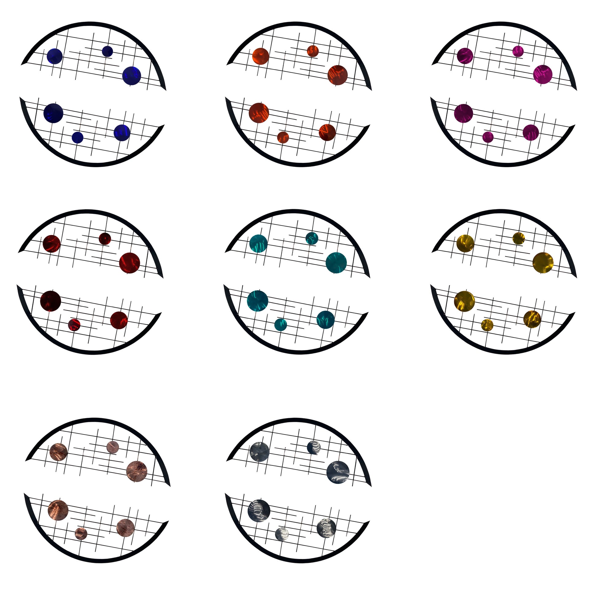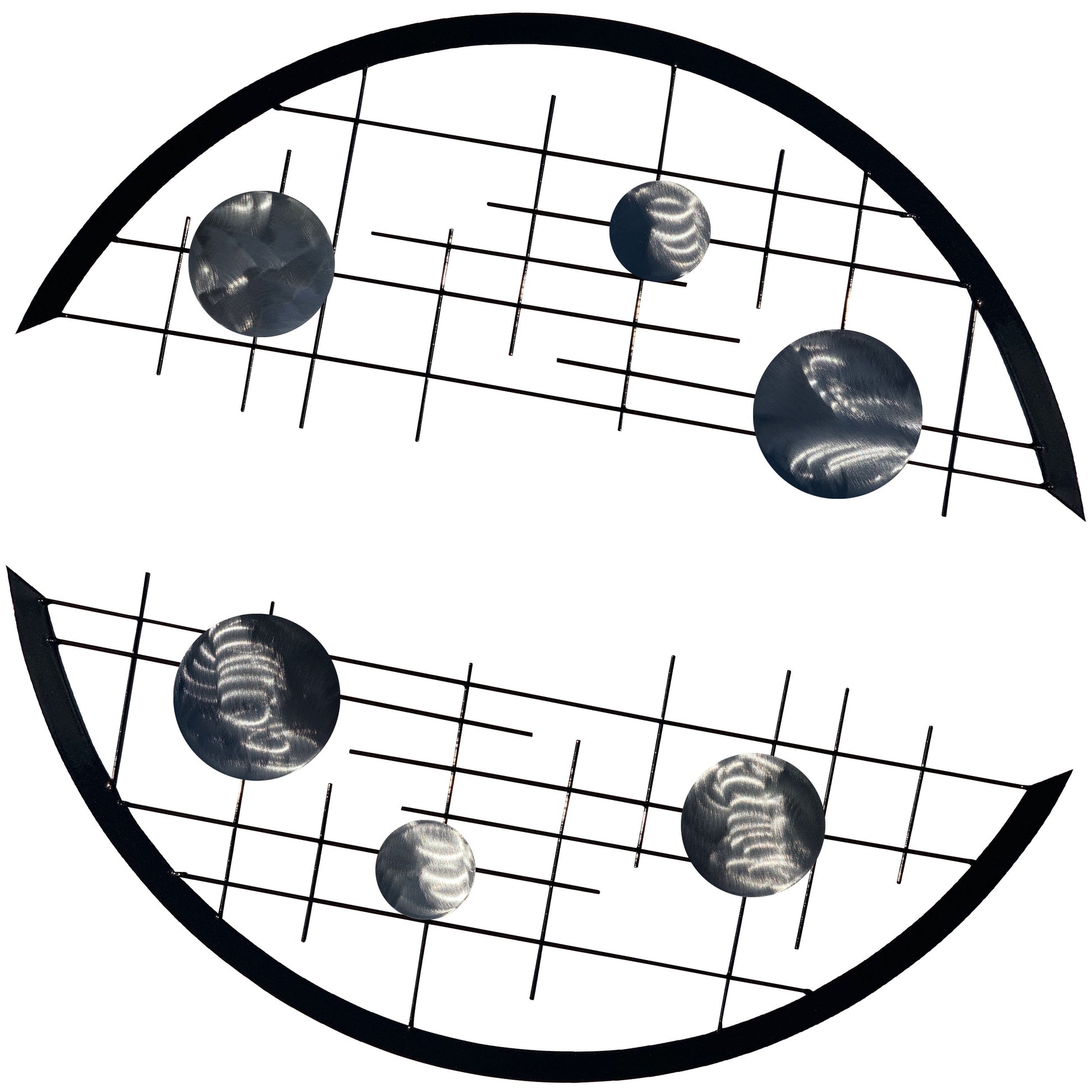 Featuring two black grid arcs with three circles each, it affords you an installation that you can play around with. Mount it in a tight circle, extended S-shape, and more! You can also use the set as borders to a piece de resistance.