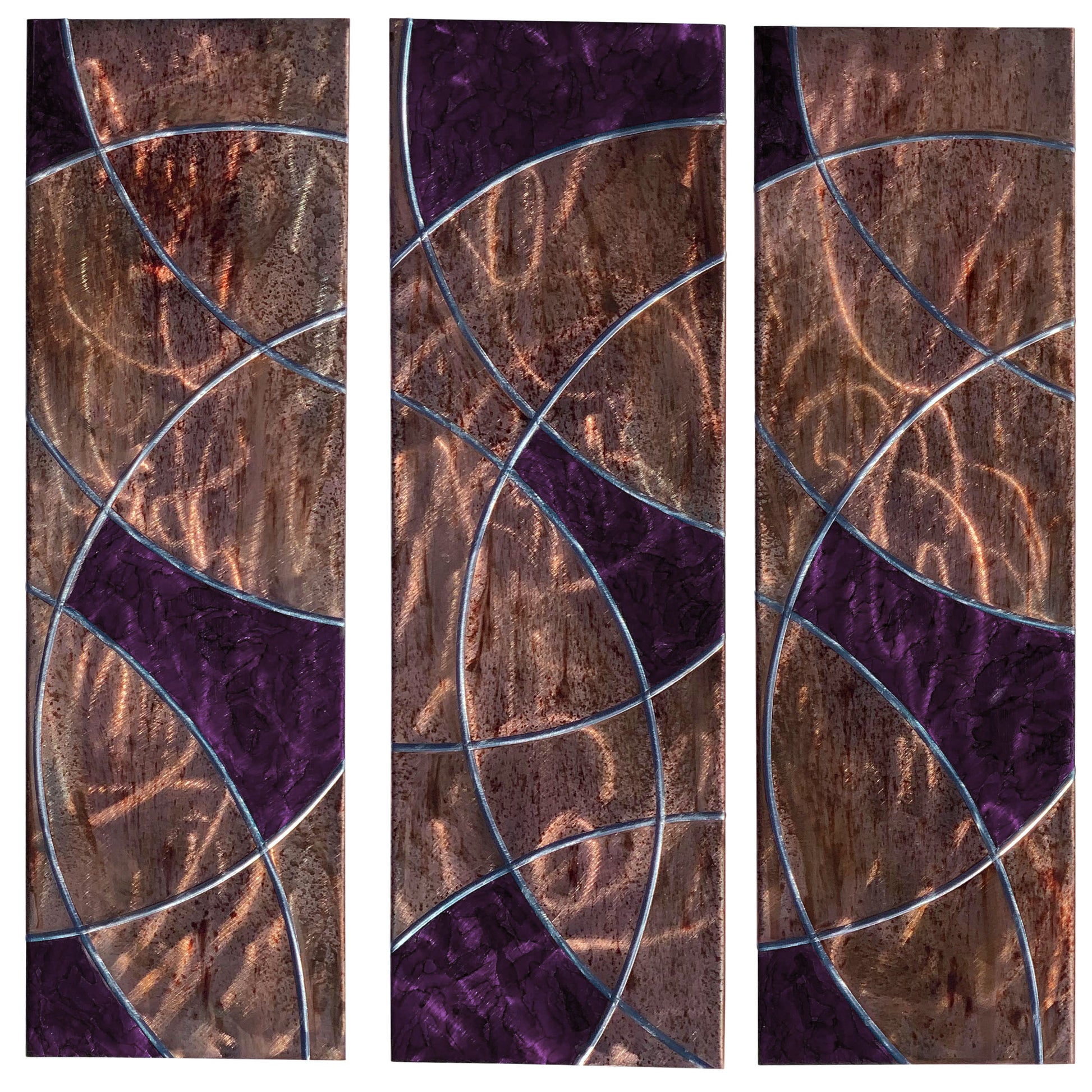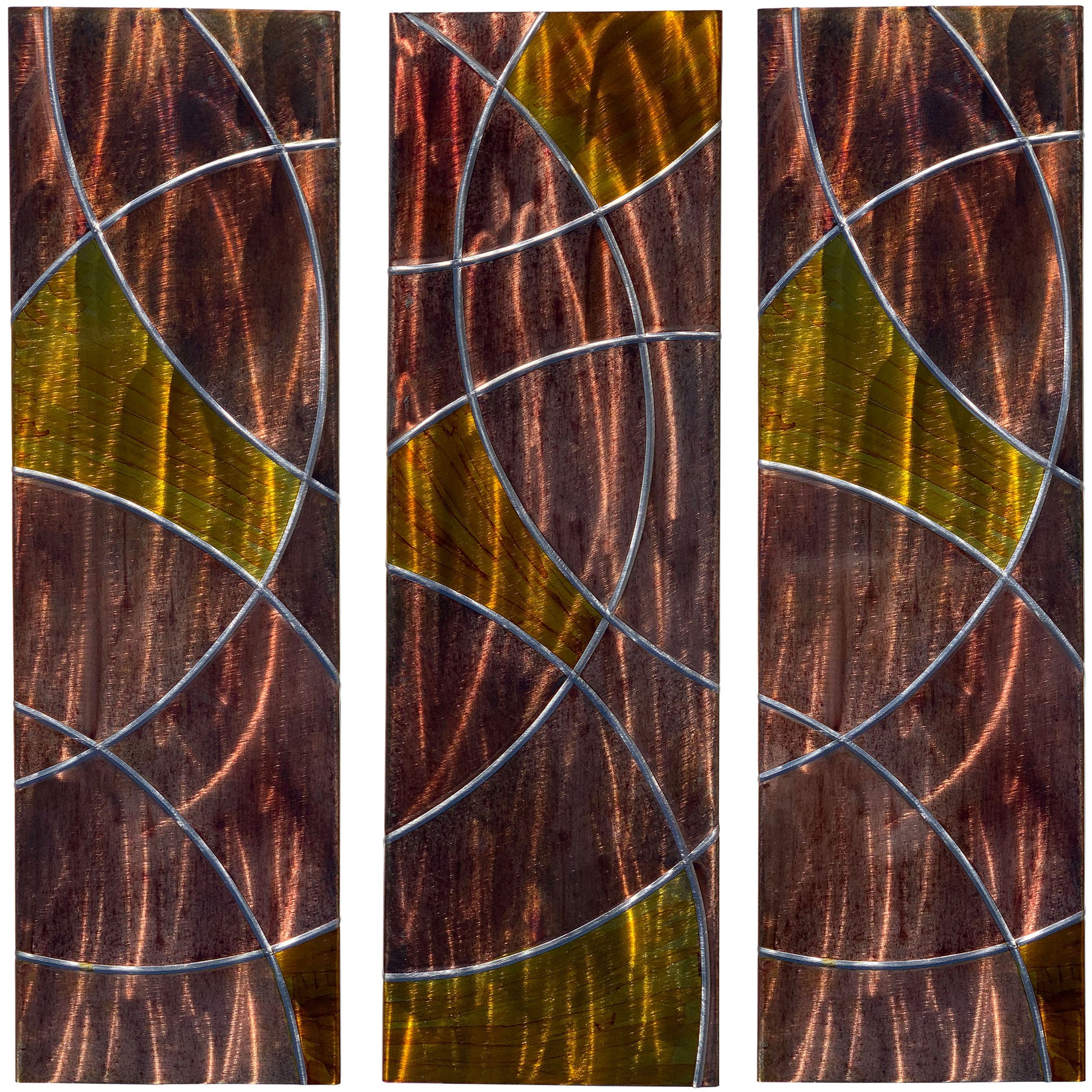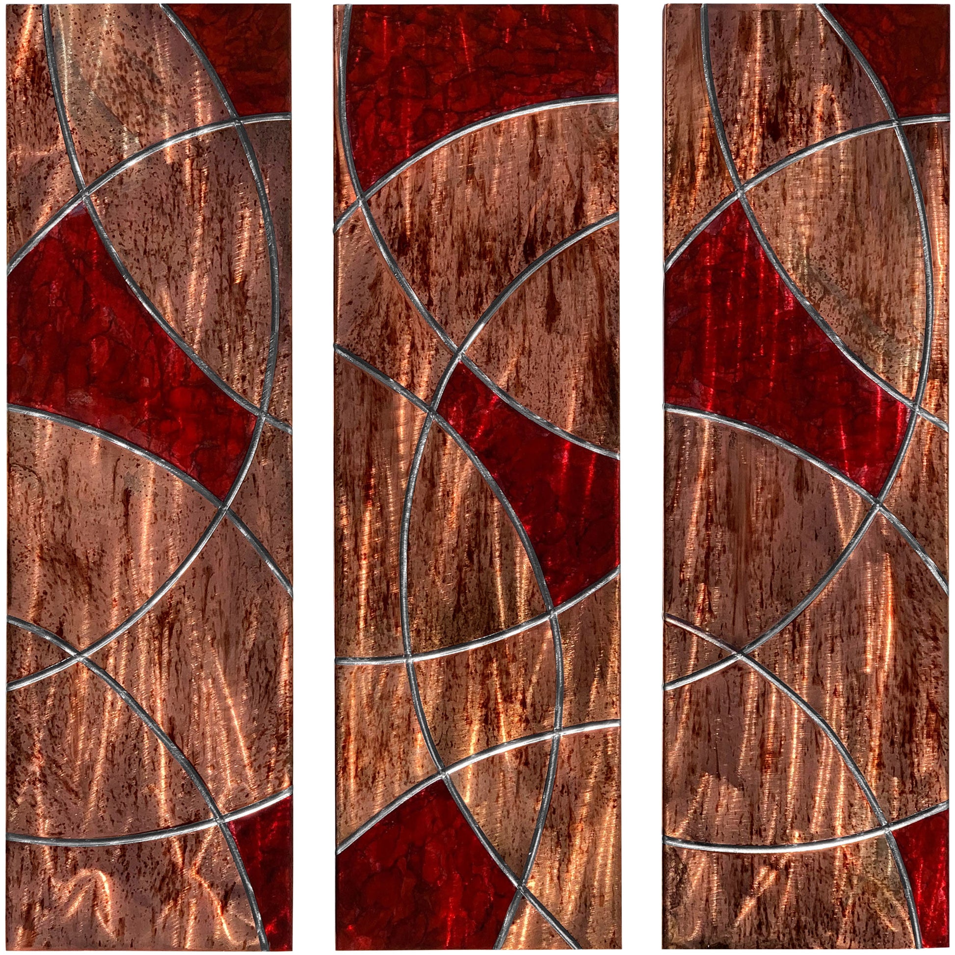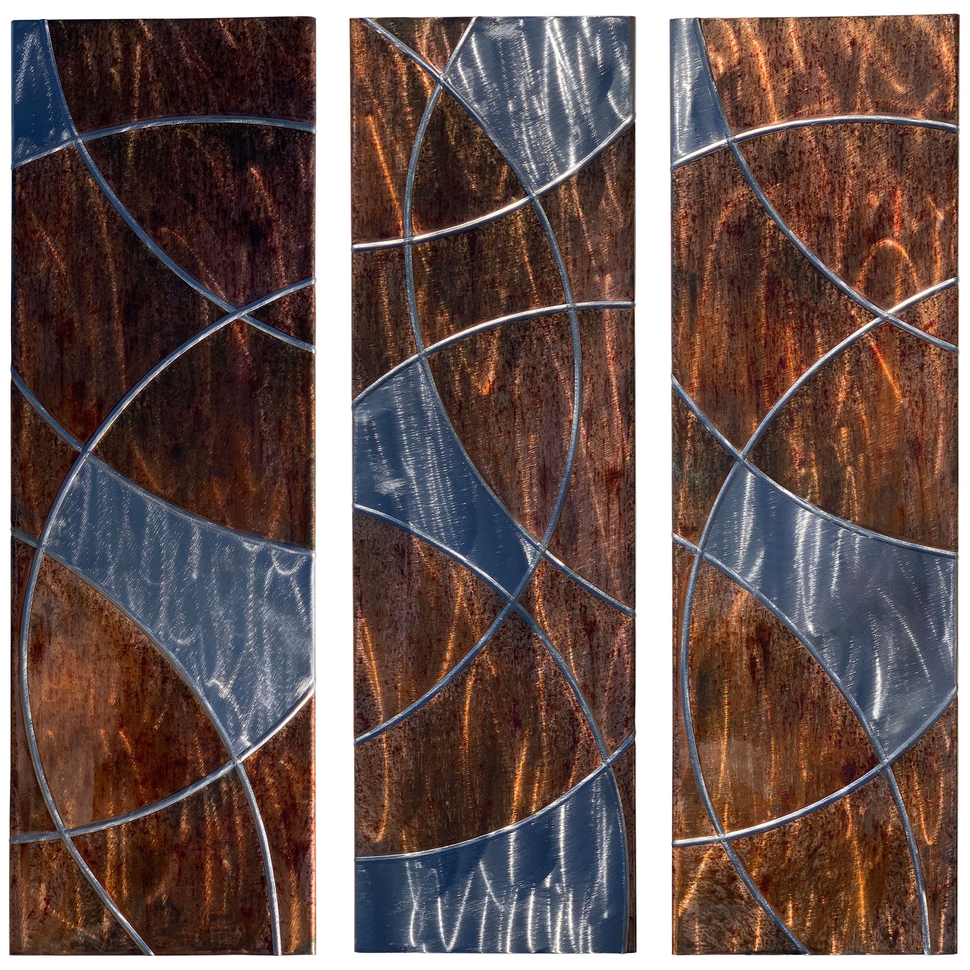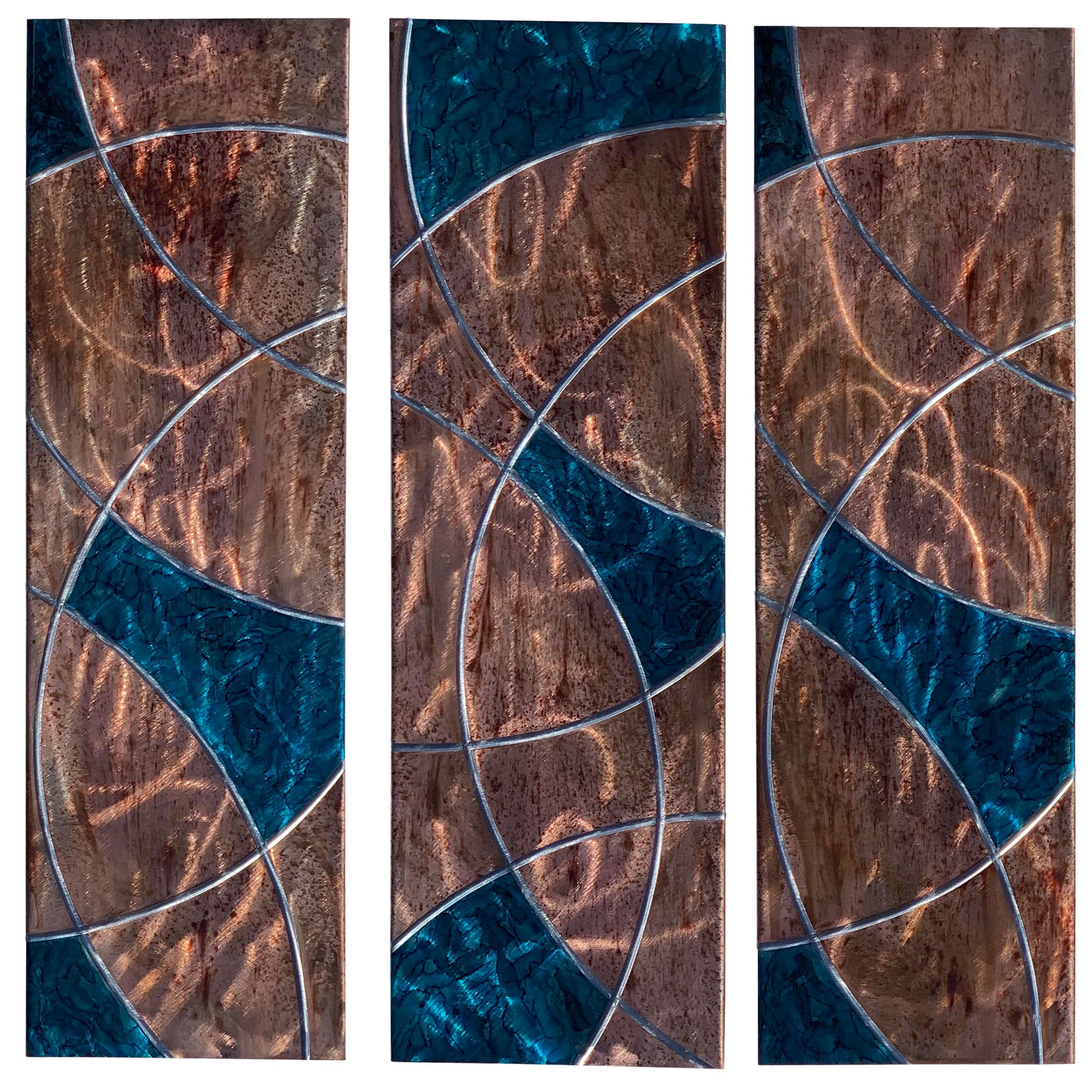 This 3-panel metal wall art is made with high-quality durable steel with our signature distressed copper finish. Brilliant silver curves carve out rounded sections, some of which we filled with a pop of color.
