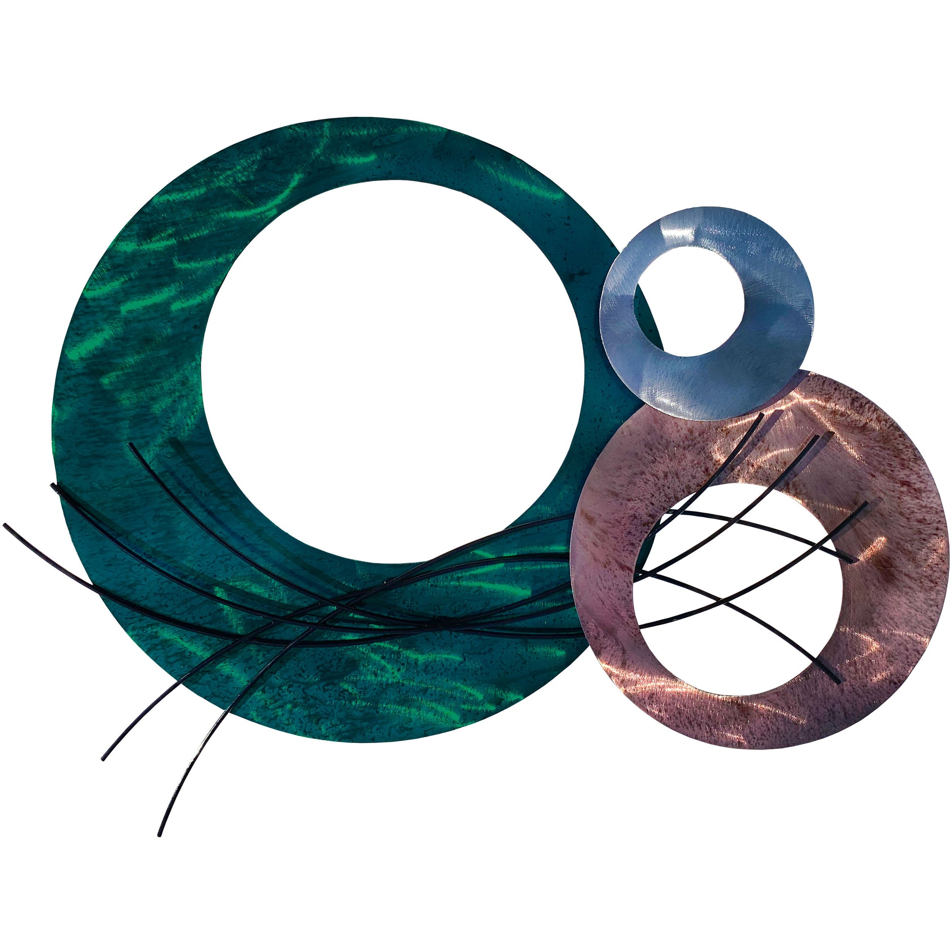 Three different sized circles cluster together to make this interesting artwork. Sometimes a symbol of the universe and life, the circle is often known to represent completeness and eternity. With the vivid candy colors and neutral metallic hues, we hope that this sculpture could represent eternal joy and peace in your home!